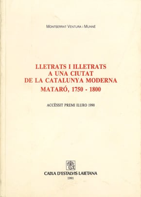 Montserrat Ventura i Munné Lletrats i illetrats a una ciutat de la Catalunya moderna. Mataró, 1750-1800 (Accèssit Premi Iluro 1990), 1991 Pròleg de Carlos Martínez Shaw Estudi sobre l’alfabetització de…